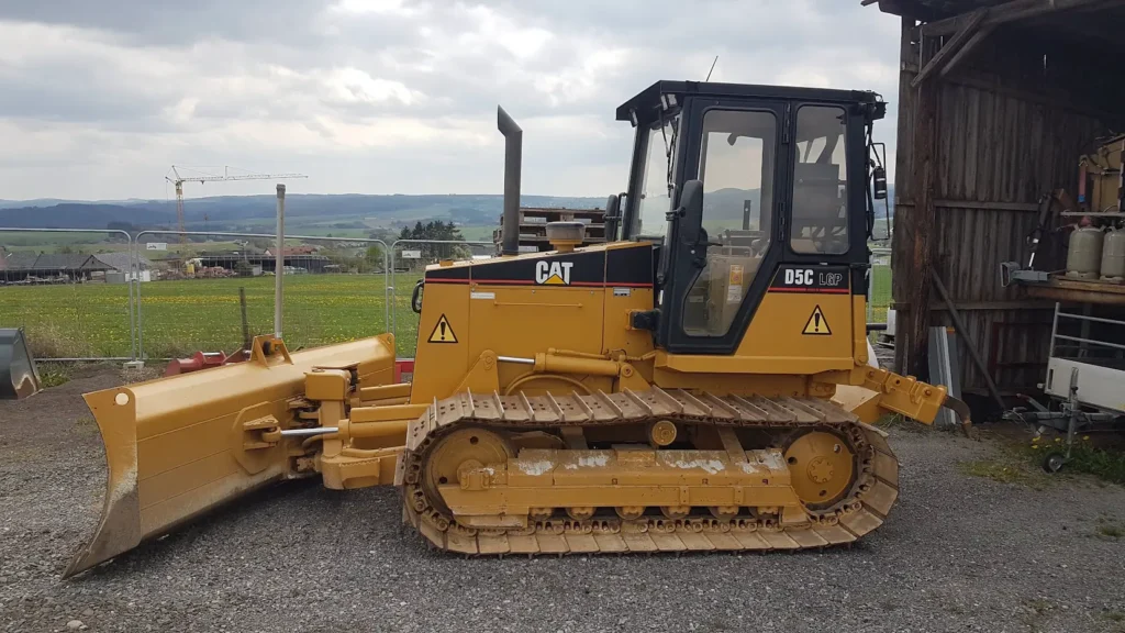 - Caterpillar D5C LGP – Planierraupe mit breiten Ketten für Arbeiten auf weichem Untergrund, optimal für Planierarbeiten und Geländeprofilierung.