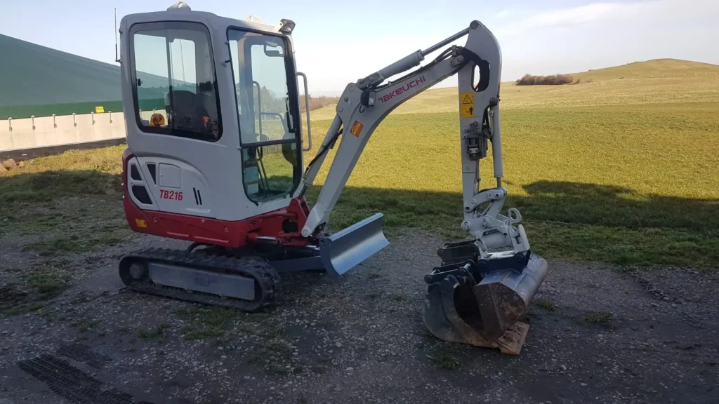 - Takeuchi TB216 – Kompakt-/Minibagger mit Planierschild, ideal für enge Baustellen und Präzisionsarbeiten.