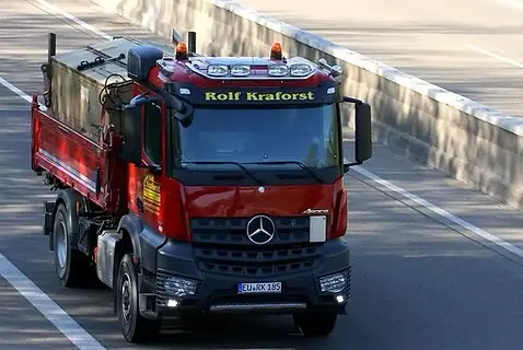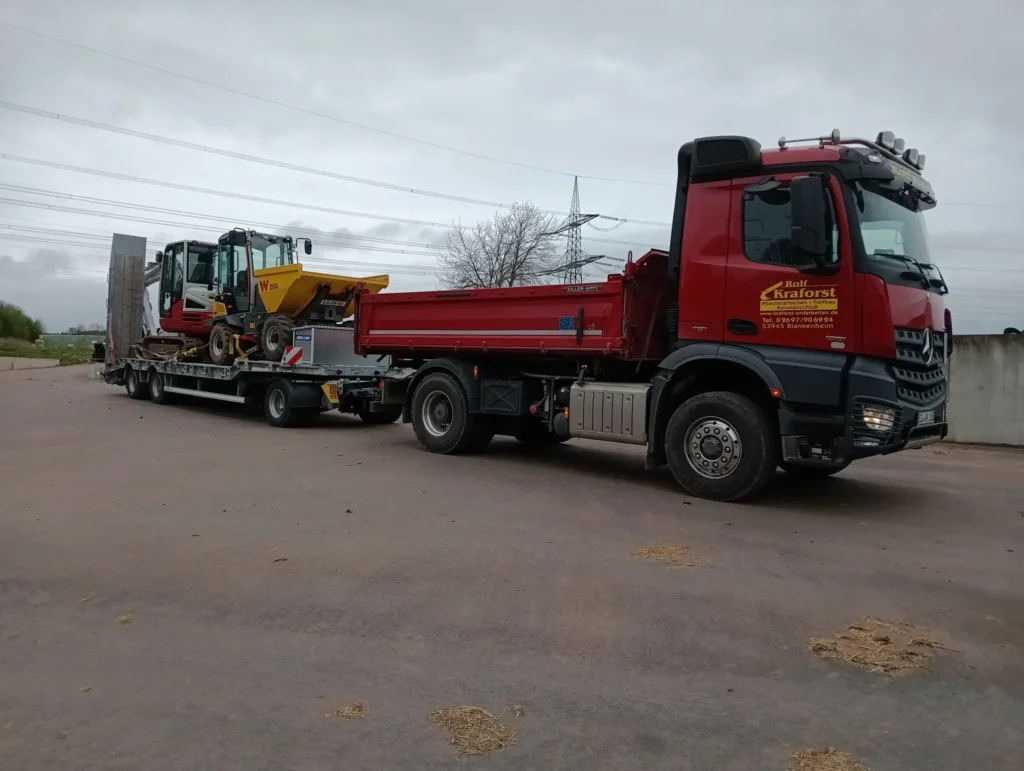 - Mercedes-Benz Arocs – 2-Achs-Kipper mit Anhänger für Schüttguttransporte und Maschinenbeförderung.