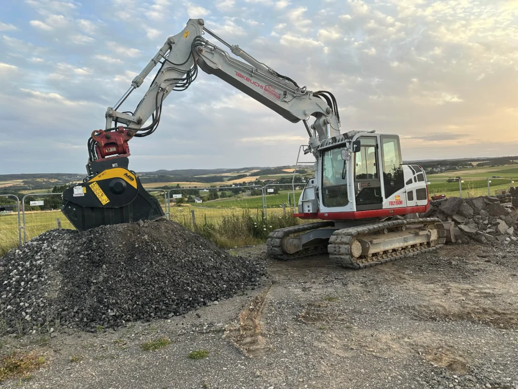 - Takeuchi TB2150R – Kettenbagger mit Anbaugeräten wie Brecherlöffel für vielseitige Erd- und Abbrucharbeiten.